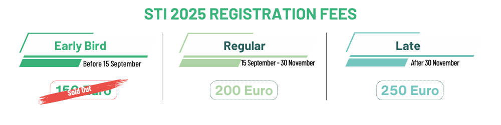 • All payments should be made "net of charges" to the bank account of the Evronas Organizasyon Danışmanlık ve İş Geliştirme A.Ş.• Please make sure to include the name of the parcitipant and STI2025 in the details of the bank transfer.